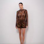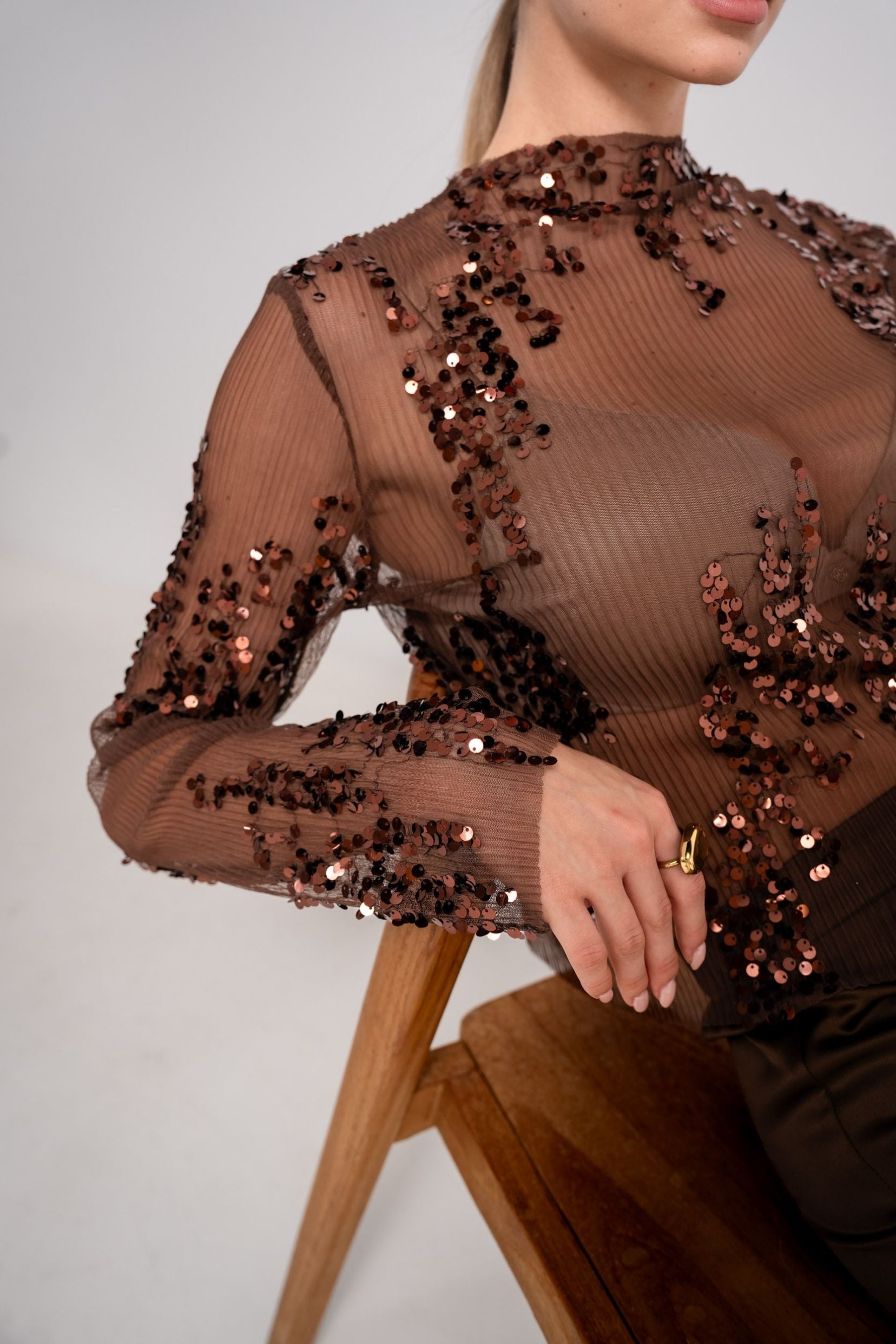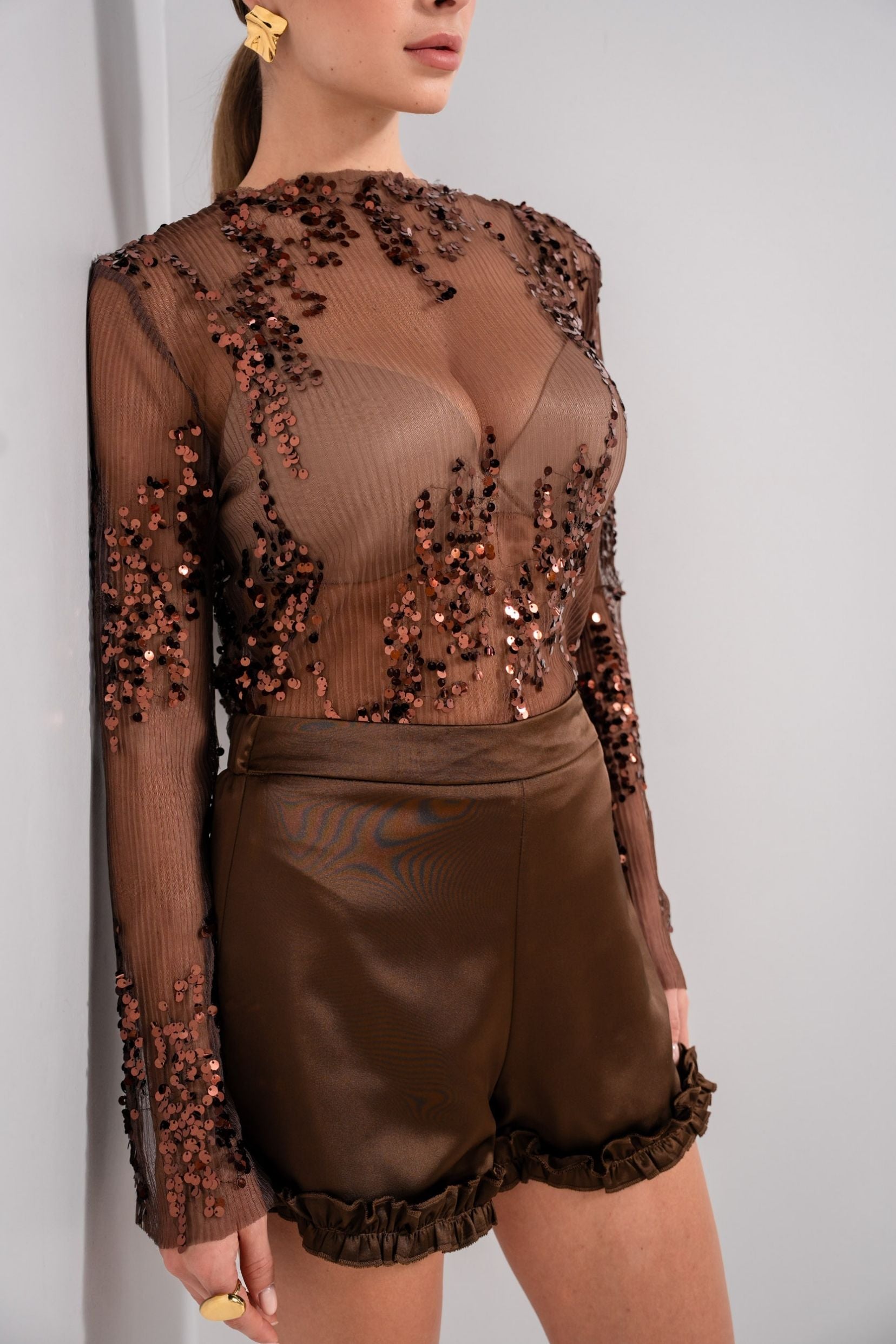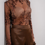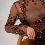 Transparence délicate, sequins brûlants, coupe seconde peau : il dévoile juste ce qu’il faut et sublime tout le reste. Un haut qui assume, qui brille, qui vit avec toi. Parfait pour celles qui aiment électriser une soirée sans effort.