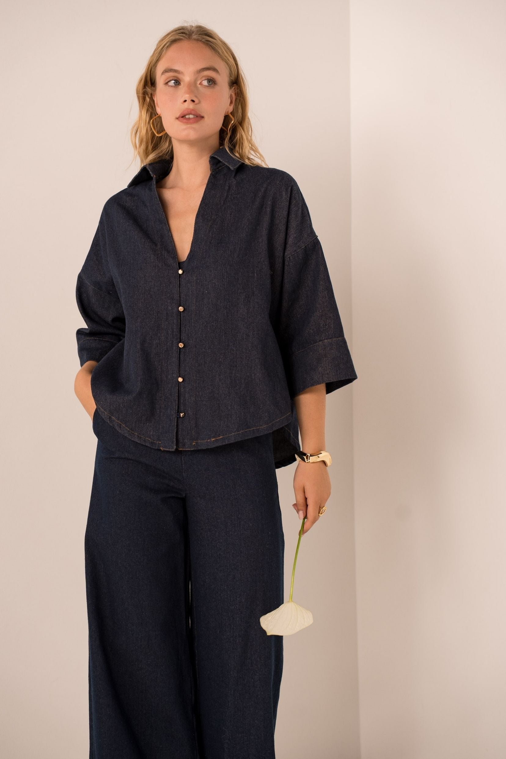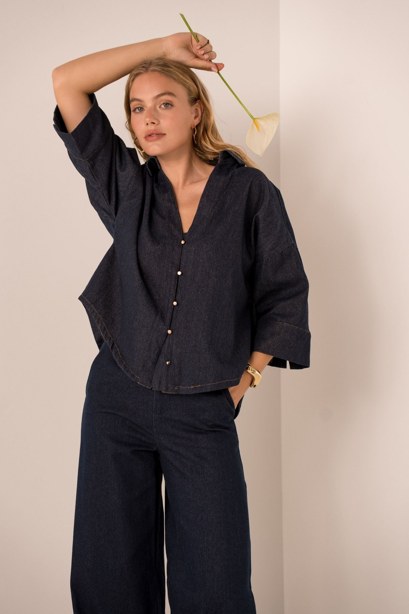 Découvrez Amira, notre chemise en denim au style intemporel. Sa coupe légèrement oversize et sa matière en jean souple offrent confort et allure décontractée. Ses détails soignés et son esprit authentique en font une pièce facile à porter et à associer.